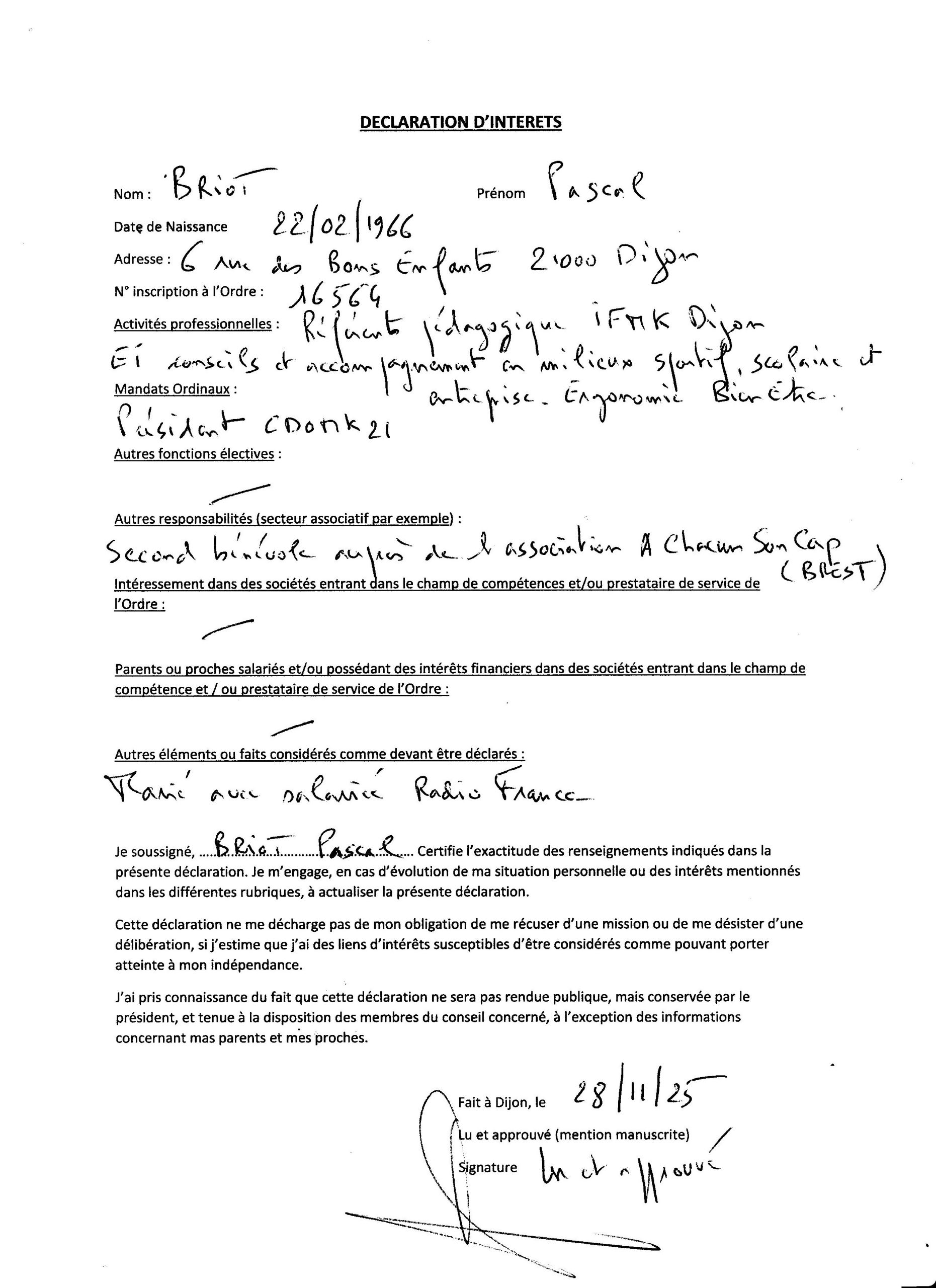 Cette déclaration d’intérêt est rendue publique et sera lisible sur le site du CDOMK 21